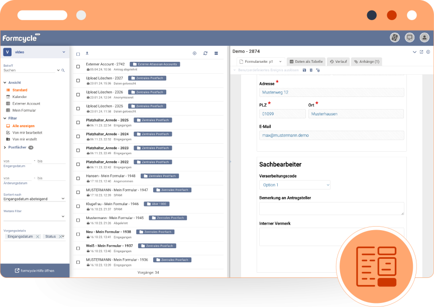 Das Postfach fungiert als zentrale Schaltstelle zur Überprüfung von Daten sowie zum Einleiten von Prozessen wie Genehmigungen, Rückfragen oder Weitergaben. Zudem ermöglicht es den Export nach Excel oder XML.